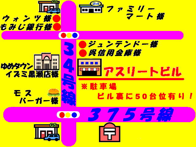 ●県道34号沿いの黒瀬ゆめタウンイズミ店前の八剣伝様の上(2F)です。